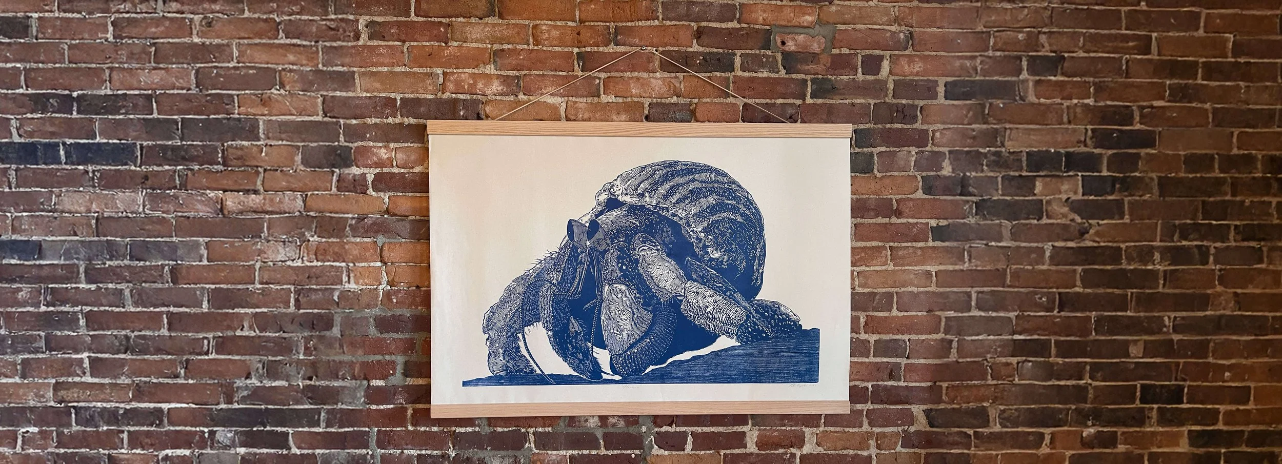Home is wherever you roam. This whimsical woodcut print of Herman the hermit crab is available on two papers: Moon Peach, with a sandy, speckled tone, and bright white Masa for a bold, modern look. Created over two months it was proofed for a BIG INK event at the A.P.E. Ltd. Gallery .