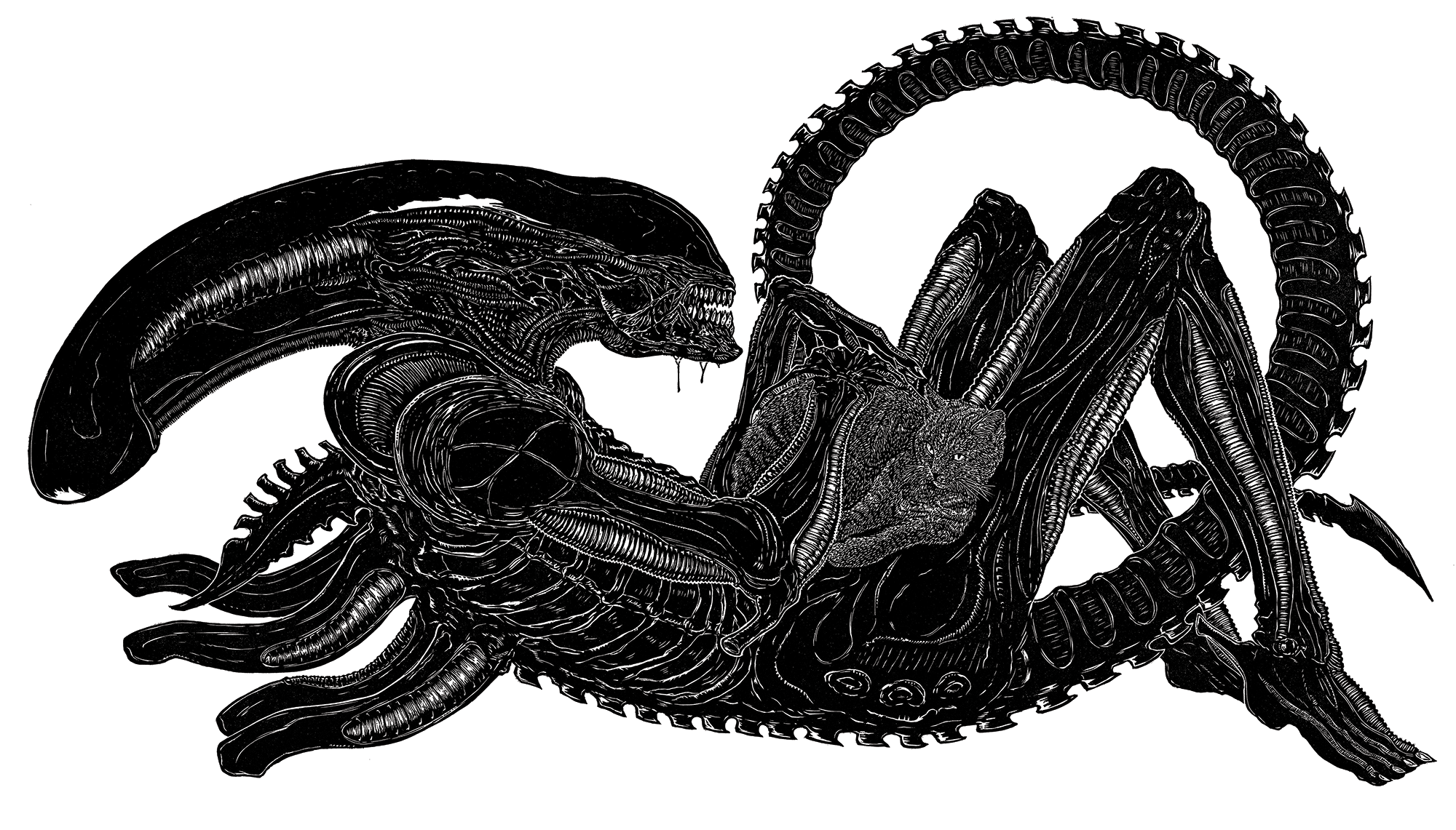 A tribute to H.R. Giger’s Alien and his feline companion, Jonesy. Despite their tense encounter aboard the Nostromo, the Alien seems more curious than hostile—maybe even in need of a cuddle. This block print was carved and proofed in association with BIG INK at Easthampton City Arts+.