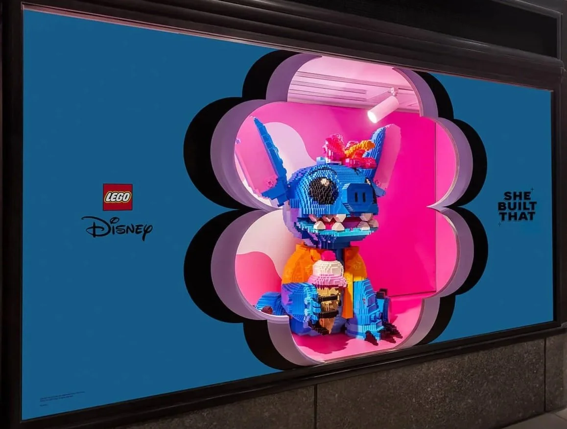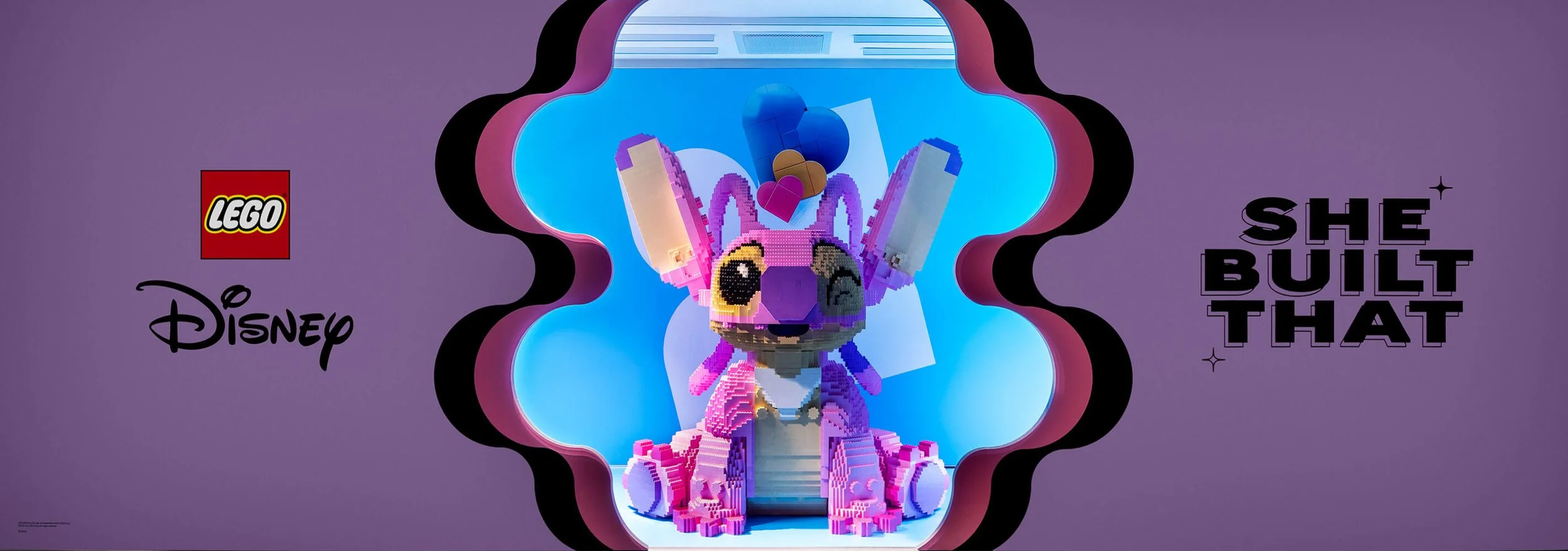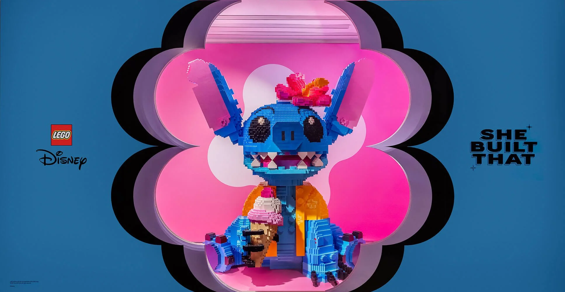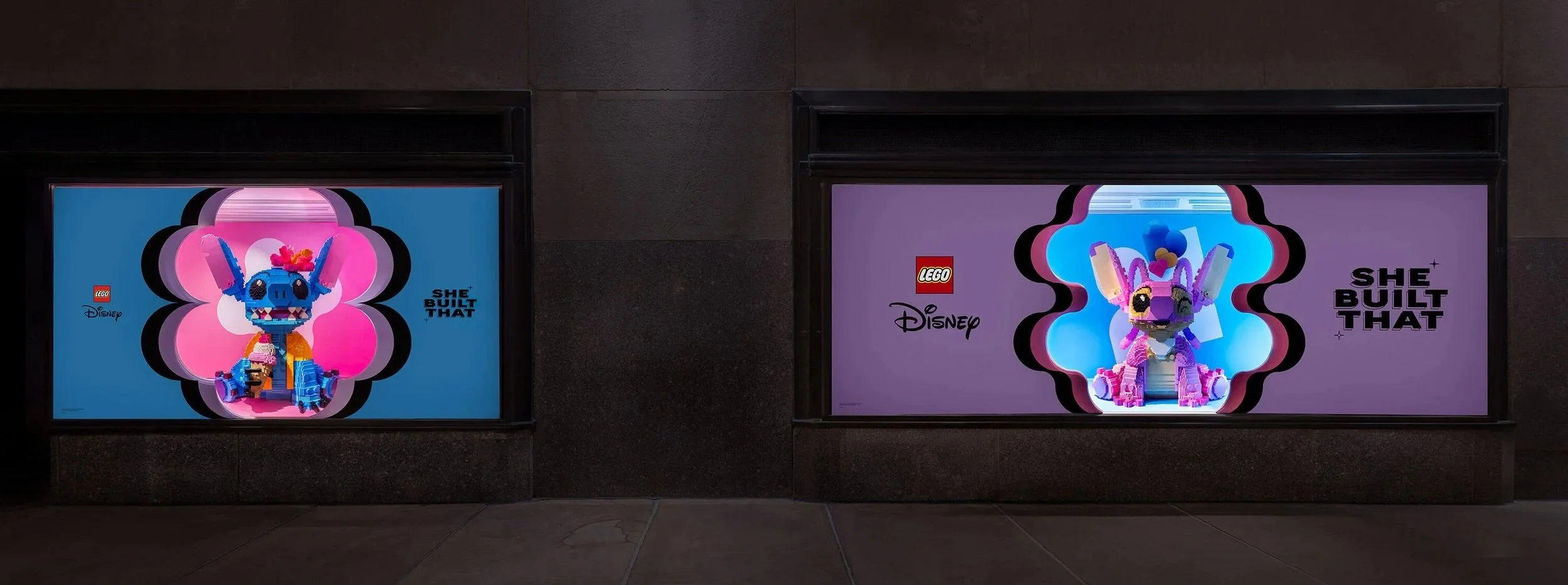 With these windows being in a high traffic area, I kept the design bold and simple—leveraging the buzz around the new Lilo & Stitch movie by spotlighting large-scale brick models of Stitch and Angel. Framed by vibrant ripple patterns and color palettes that reinforced their connection, the windows generated major excitement.