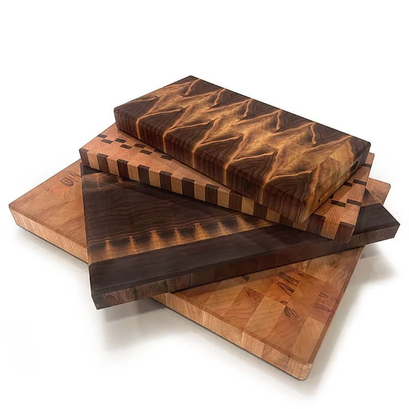 Handcrafted cutting boards made from a variety of wood species, each with its own unique design.